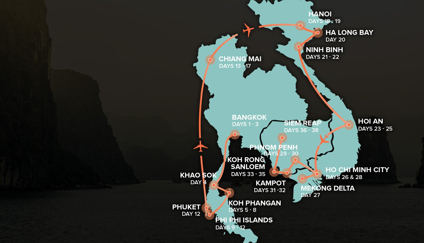 Over 38 incredible days you’ll experience crazy Bangkok and Hanoi, discover ancient temples and culture, party on the famous 'full moon' beach, explore the stunning Phi Phi Islands, experience a once in a lifetime day at an elephant sanctuary, experience the stunning Ha Long Bay, go crab fishing with traditional fisherman, snorkel around tropical islands, explore the famous Angkor Wat temple & much more!