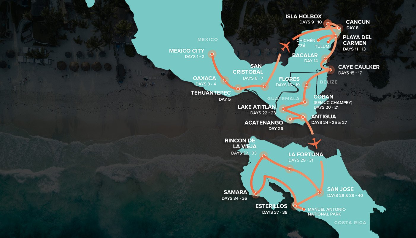 Prepare yourself for a thrilling adventure deep into the heart of Central America, where volcanic peaks roar with fire, the world’s second-largest barrier reef teems with vibrant marine life, and ancient Mayan cultures await. Our 40 day adventure through Mexico, Belize, Guatemala and Costa Rica will leave you spellbound. Dive into mesmerising underwater realms, gaze in awe before ancient pyramids that rise from lush jungles, and conquer the heights of a volcano, with some authentic, off-the-beaten-track experiences along the way. You won’t be alone – an awesome group leader and a band of adventurous new friends will be right by your side. The trip of a lifetime is calling your name, and the jungle is bursting with adventure.
